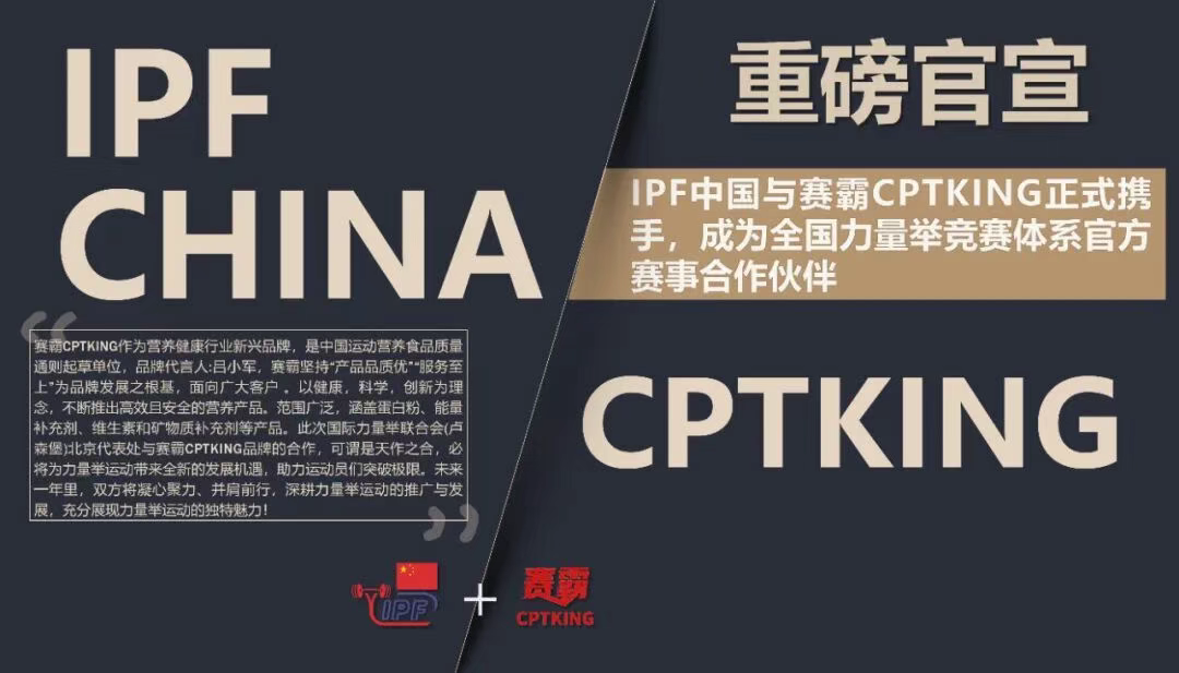 赛霸CPTKING正式与国际力量举联合会(卢森堡)北京代表处达成官方赛事战略合作!双方已完成签约,将围绕全国力量举竞赛体系(ABC级赛事)展开全方位合作,以专业赛事为纽带,用科学营养作支撑,携手推动力量举运动在国内迈上新高度!